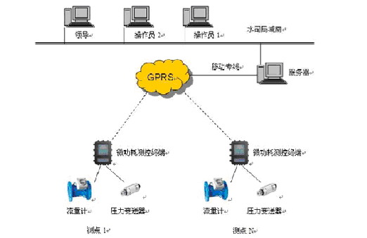 自来水厂调度中心、各职能部门之间数据通信在局域网内完成;管网测点与自来水厂调度中心之间采用GPRS无线通信。