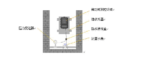 将防水外罩安装在监测井井壁上,微功耗测控终端放置在防水罩内。压力变送器信号线、水表信号线接在微功耗测控终端自带的防水接线盒上。