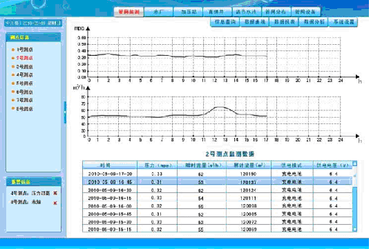 ◆生成每条管线压力分布曲线。 生成各种工作报表。 辅助预测、发现爆管事故;提供辅助决策建议。 存储、查询、对比历史数据。 远程维护监测设备。