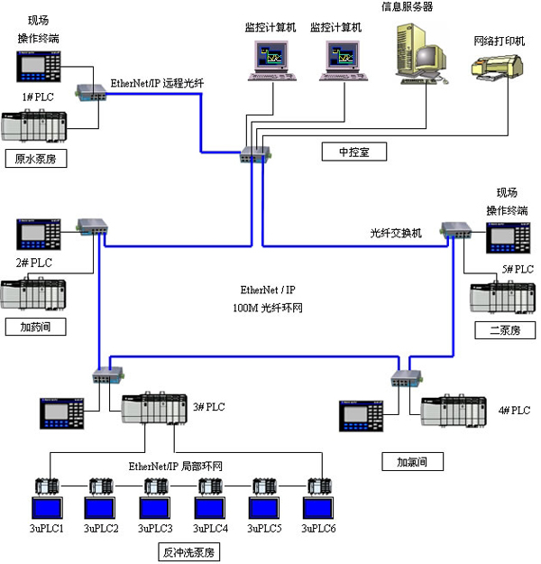 图3 净水工艺流程图 采用如上所述的自动加氯控制系统。选用德国西门子公司生产的S7-200系列的可编程控制器PLC,它可靠性高,功能齐全,有丰富的编程指令,存储容量相对较大,采用??榻峁?,可根据需要配置不同的???。软件设计采用西门子公司的STEP7 开发软件。该软件采用梯形图及语句表设计语言,同时具有功能块设计思想。采用结构化设计的思想,程序利用逻辑块间的参数和数据传递控制过程。 经过近一年的运行实践证明,采用自动投氯系统可以实现加氯量的最佳工况。在原水水质及运转工况等有微小变化波动时,人工控制难以进行精确和及时调节,而自动投氯系统则能做到这点,说明系统的适应性更强,稳定性更高。整个自动加氯系统完善、配置合理,自动化程度高。采用自动加氯系统,大大提高了水质安全的可靠性,同时也减轻了工人的劳动强度,防止人为操作失误,节约投加量。表1为2004年7月----9月净水指标统计数据。