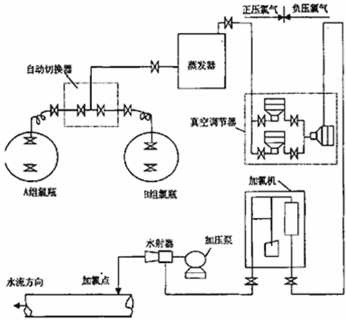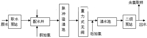 图2 加氯工作流程图 如图2示:前加氯系统与后加氯系统共用一个氯气气源,共设两组供氯氯瓶,两组氯瓶互为备用.,根据气瓶压力自动切换。如当正在使用的一组氯瓶出口管上的压力小于某个值时,压力式自动切换器将自动切换到另一组氯瓶,保证连续供氯。在加氯自动控制系统中,将PLC的模拟量输出信号送给加氯机的模拟量输入端,通过控制加氯机中执行器的动作,控制水射器中的真空度,进而控制了加氯量的大小。加氯自动控制系统中还包括氯气气源的自动切换,漏气自动报警和漏氯吸收装置的自动控制。在加氯自动控制系统中,关键是对加氯机的控制。 自动控制氯系统可进一步配备计算机数据采集系统,以便实现加氯间无人值班目标。把出厂水中的余氯分析仪测定的数据送到加氯间,中心化验室和调度室,以便值班人员可随时监测出厂水余氯值和调整余氯设定值。 3影响加氯自动控制的主要原因(1)采样时间 采样时间的长短,直接影响加氯的效果。为了达到自动控制的目的,要求氯气经充分混合后马上检查余氯值作为复合环控制的反馈信号。但现场中,有的工艺设计将混合接触时间定的太长,对控制系统来说,即意味着纯滞后时间的延长,造成测定结果不准确。因此,在后加氯的投加点和采样点的选择上,工艺设计时应充分考虑自动控制的要求。通常情况下,后加氯在清水池进水管上,在氯气与水充分混合后应在尽可能短的时间内取样,水经过加氯点到余氯分析仪处的水流时间一般不要超过5分钟,在水与氯气充分混合的前提下取样时间越短越好??捎萌缦露址椒鬯醵倘⊙奔洌阂皇撬醵倘⊙艿某ざ?;二是加快取样管中的水流速度如加大取样水管排水分流管。(2)检测设备 余氯分析仪的检测值的正确性也是控制加氯的关键。由于余氯分析仪存在零点漂移,应定期进行校正。同时在软件编制时,对信号数据的处理也可考虑滤波、稳定等形式进行适当处理以增加数据的可靠性。(3)信号传输 主要是各底层设备的检测信号要及时准确的传输到PLC中,然后进行处理。现场中大都设备采用标准电流信号(0―20mA或4―20mA)。4 自动加氯系统的应用 南方某一水厂,以江水为水源,水厂原设计规模为6万m3/d。工艺流程如下示: